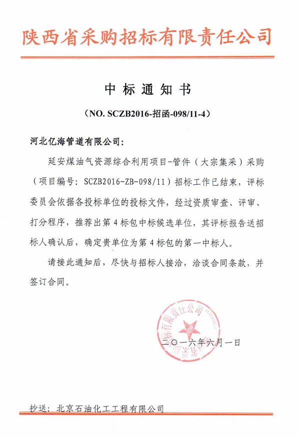 公司成功中標(biāo)延長石油延安煤油氣綜合利用項(xiàng)目焊制管件標(biāo)段